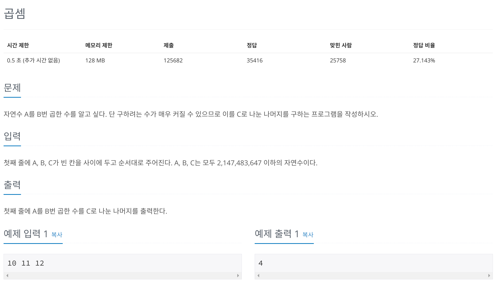#문제 1629번: 곱셈 https://www.acmicpc.net/problem/1629 1629번: 곱셈 첫째 줄에 A, B, C가 빈 칸을 사이에 두고 순서대로 주어진다. A, B, C는 모두 2,147,483,647 이하의 자연수이다. www.acmicpc.net #접근방법 일반적